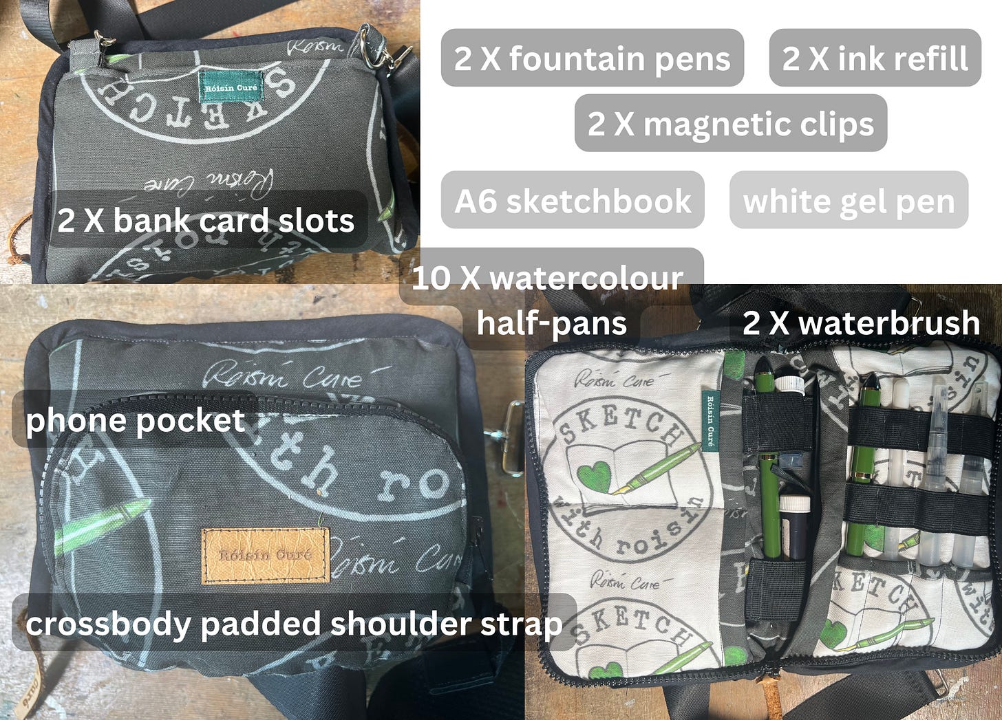 I took most of these things on board: the bag is made in the fabric I designed with my logo on it, rather than the black fake suede I toyed with. I really thought about the spill factor, and after a few near-disasters where I didn’t notice dropped pens, I redesigned it so that nothing falls out now.